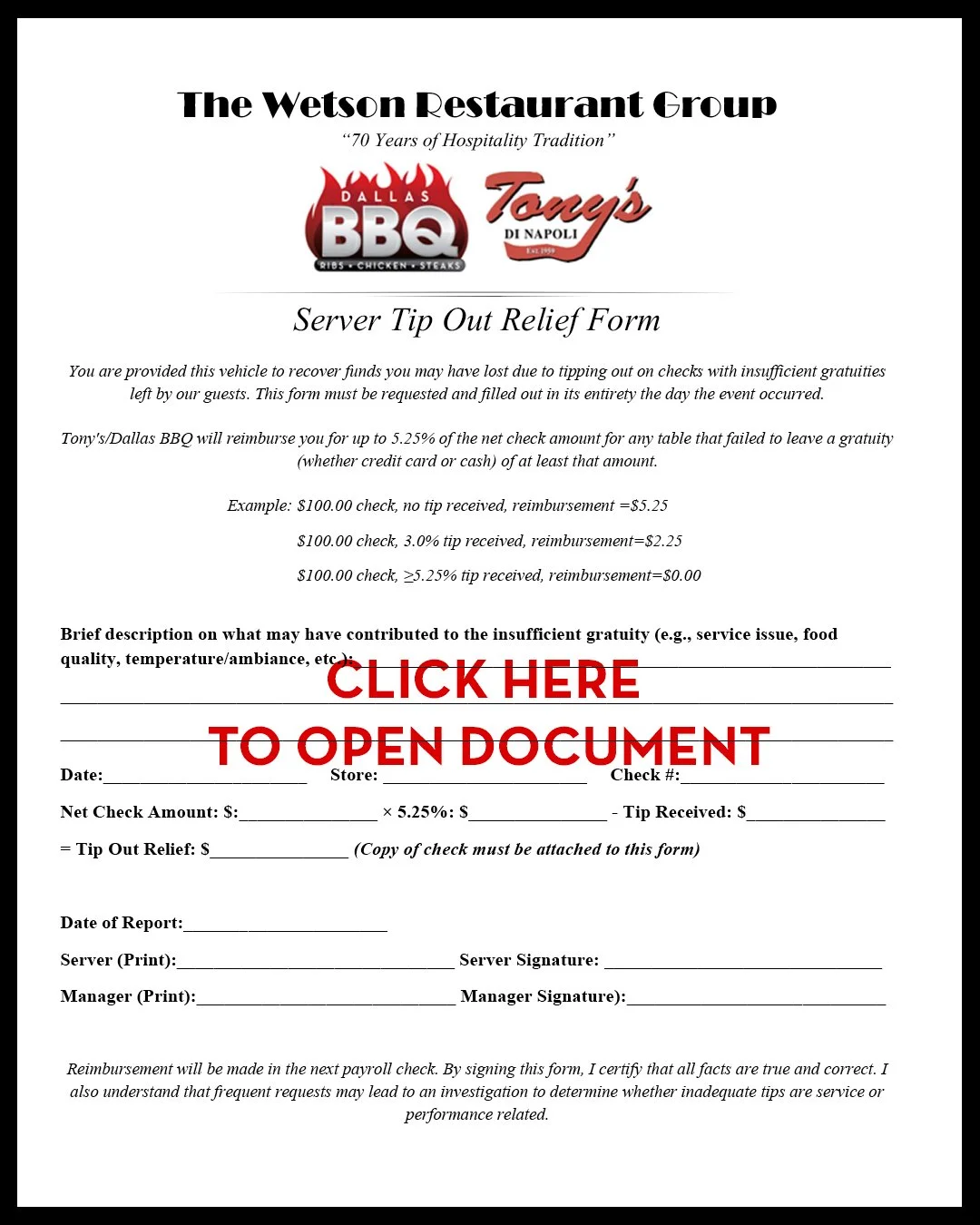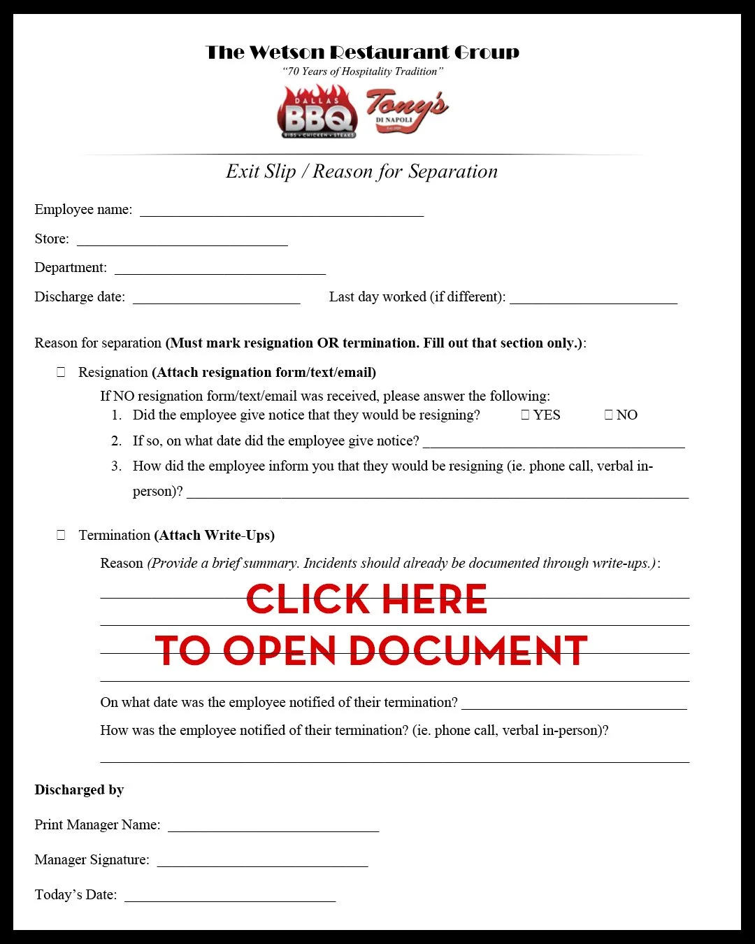 HUMAN RESOURCES FORMS LIBRARY NEW HIRE EXIT SLIP SICK DAY WRITE-UP RESIGNATION FORM TIP RELIEF MEAL BENEFIT OPT IN MEAL BENEFIT OPT OUT WISELY CONSENT FORM (ENGLISH) WISELY CONSENT FORM (SPANISH) LIST OF ACCEPTABLE DOCUMENTS